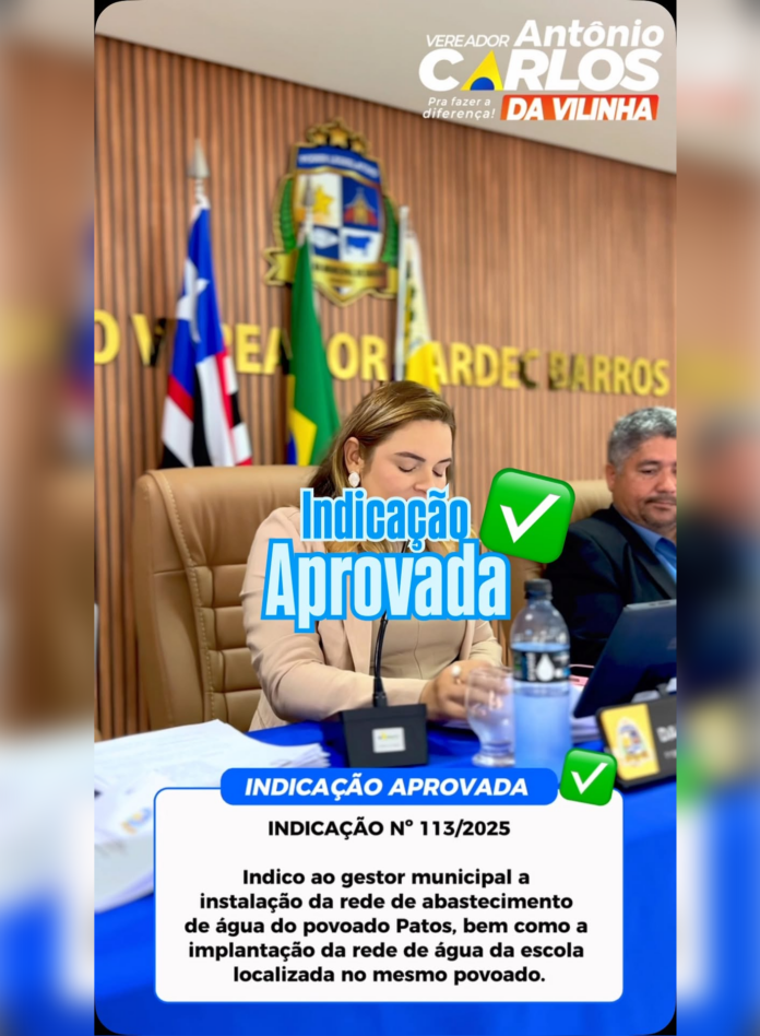 Hoje, na Câmara Municipal, o vereador Antonio Carlos da Vilinha protocolou a Indicação nº 113/2025, solicitando ao gestor municipal a instalação da rede de abastecimento de água no povoado Patos, bem como a implantação da rede de água na escola da comunidade.
